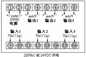 由220VAC或24VDC供電,將輸入的三相交流電流或電壓信號(hào)轉(zhuǎn)換為三路
